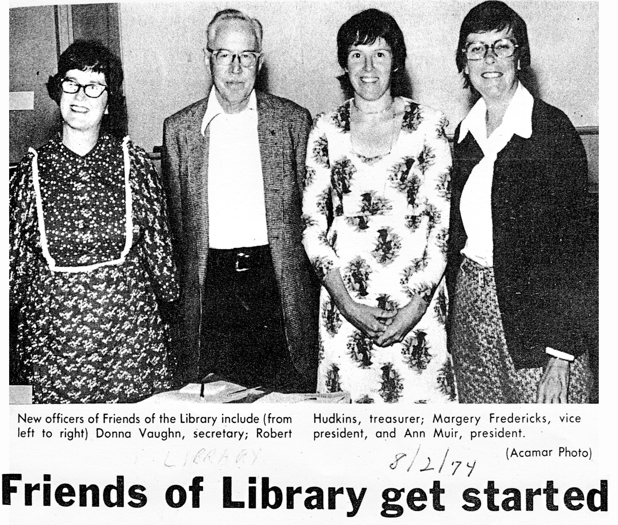 An early newspaper photo from August 1974 shows Donna Vaughn, Robert Hudkins, Margery Fredericks and Ann Muir as the first officers of the Friends. Jack Vaughn wrote the first articles of incorporation.